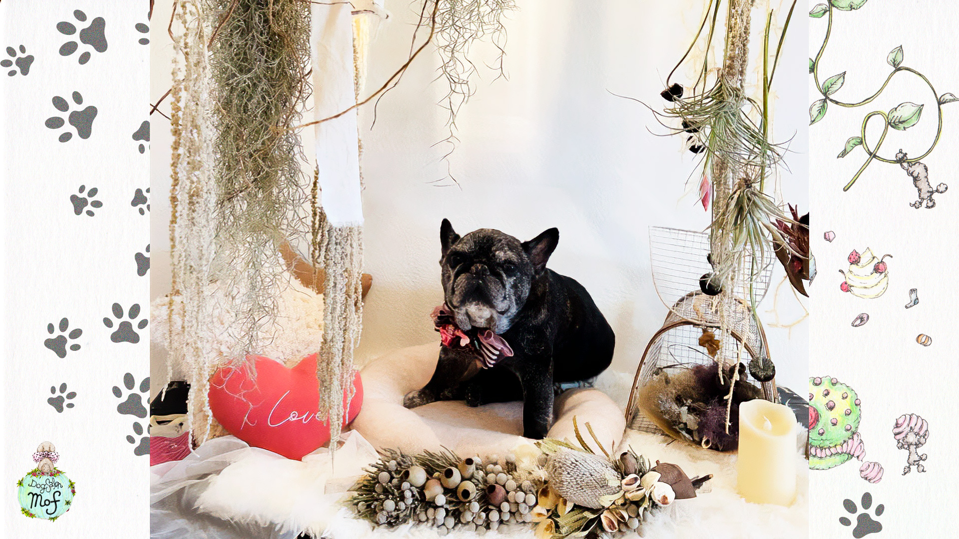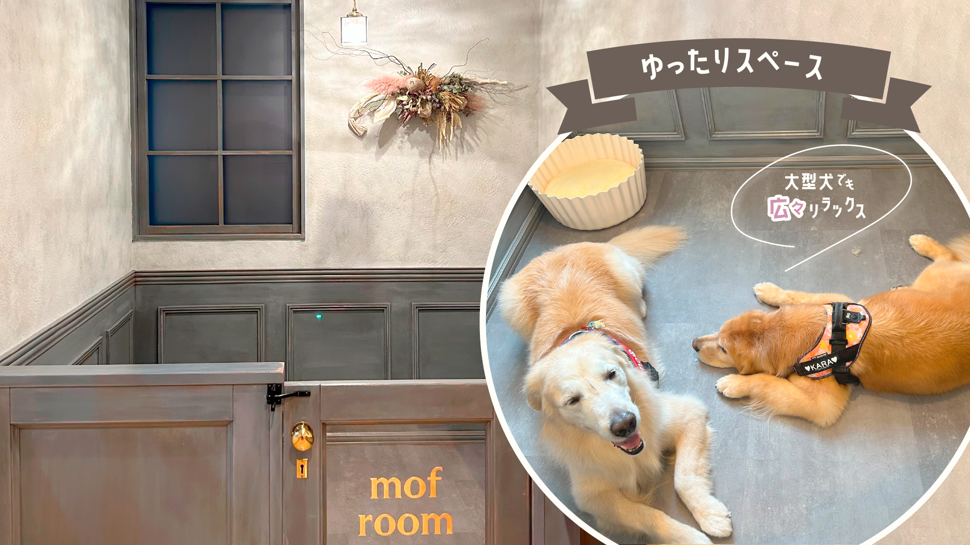 大きな窓とペンダントライト、ドライフラワーアレンジメントがアクセントになったアンティーク調の落ち着いた空間になっています。見た目だけじゃないこのroomは、ワンちゃんの足に優しい滑り止めのワックスを塗っており、大きな子でもリラックスして寝転べる広さです。